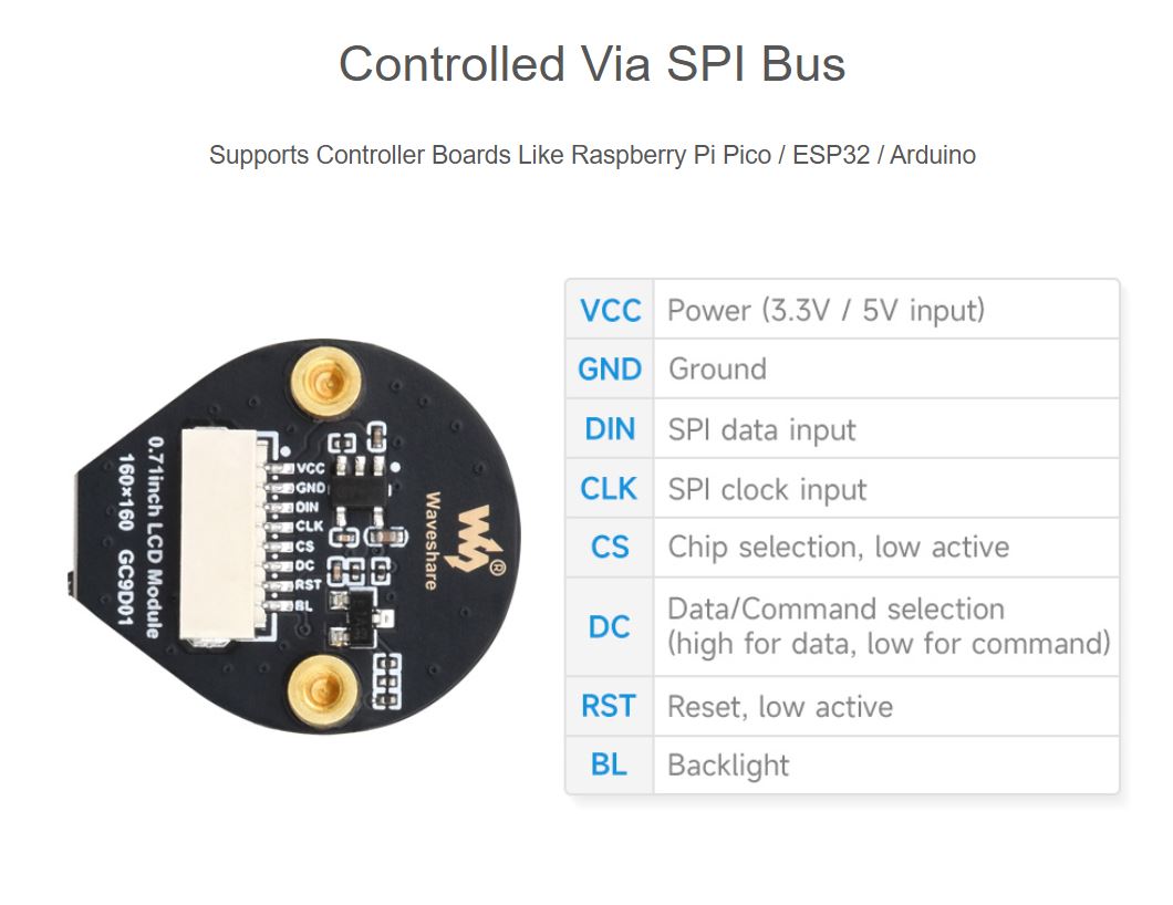 - SPI interface, minimizes required IO pins, supports controller boards like Raspberry Pi Pico / ESP32 / Arduino