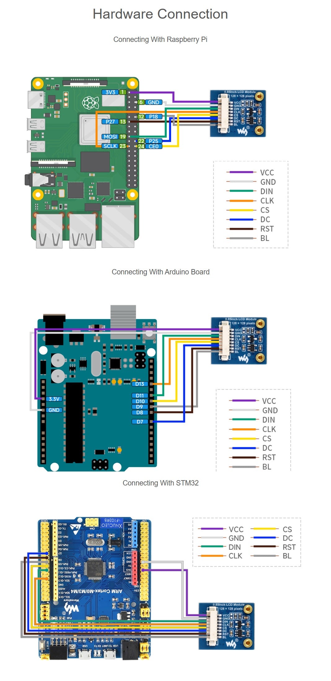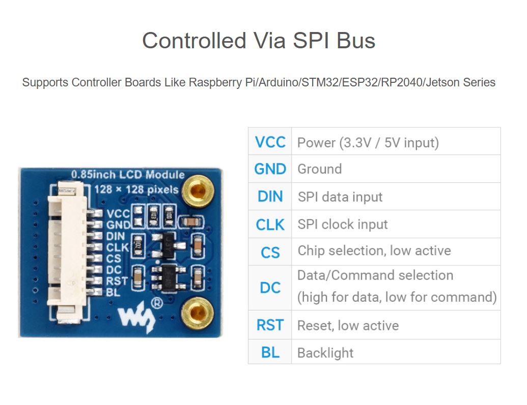 - SPI interface, minimizes required IO pins, supports controller boards like Raspberry Pi/Arduino/STM32/ESP32/RP2040/Jetson series