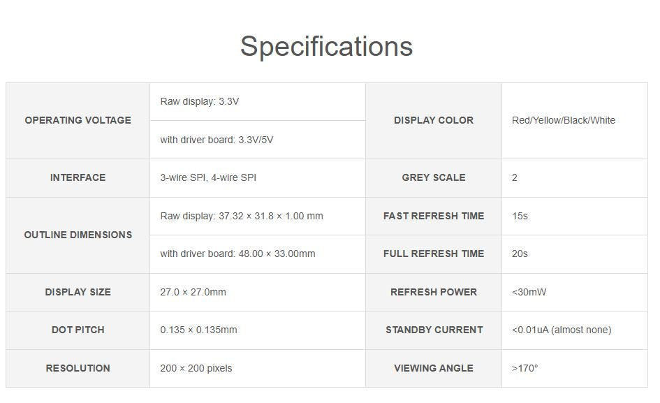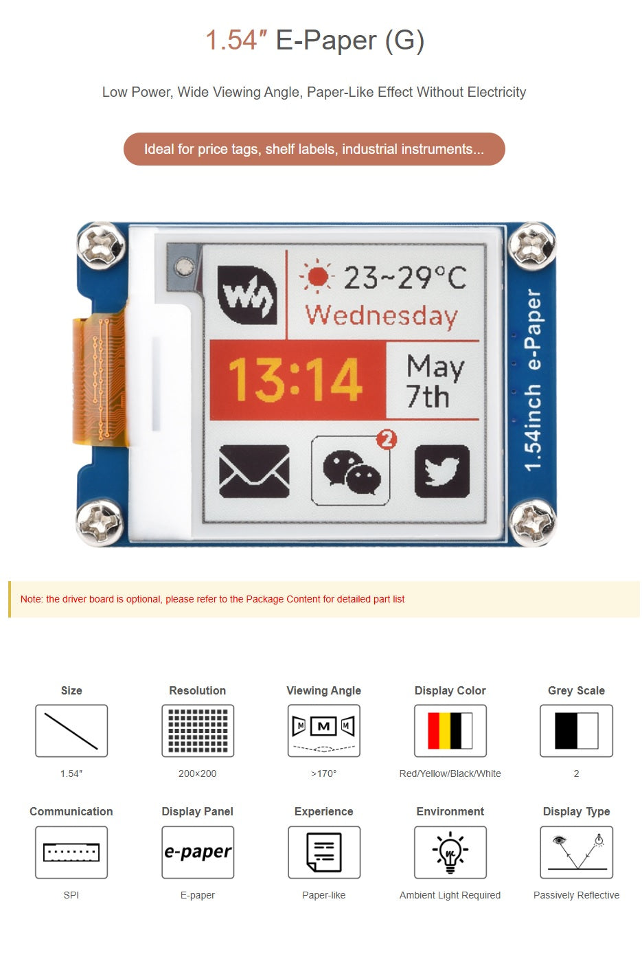 1.54inch e-Paper display (G), e-ink display, 200x200, Red/Yellow/Black/White, SPI Interface