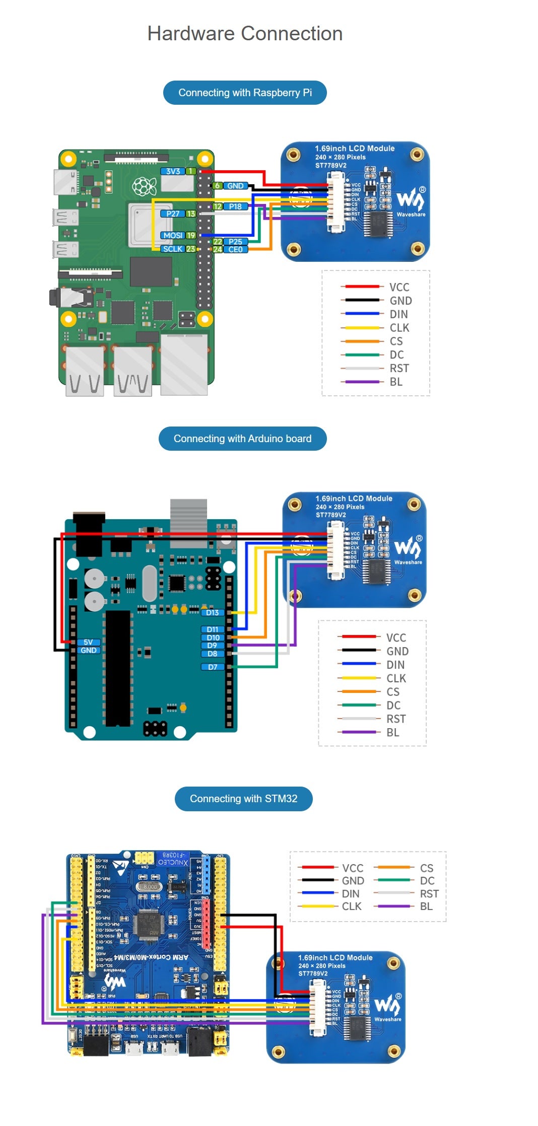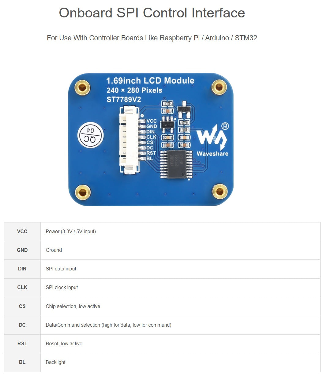 - SPI interface, minimizes required IO pins, supports controller boards like Raspberry Pi/Arduino/STM32