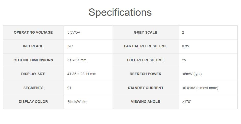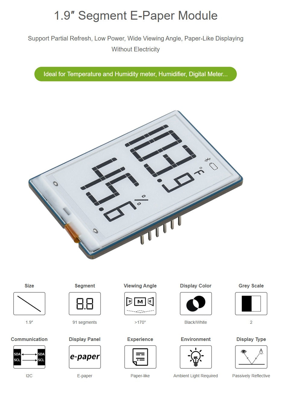1.9inch Segment E-Paper Module, 91 Segments, I2C Bus, Ideal for Temperature and humidity meter, Humidifier, Digital Meter