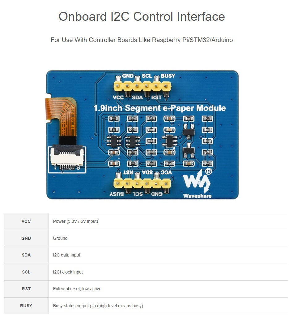 - I2C interface, for connecting with controller boards like Raspberry Pi/Arduino/STM32, etc.