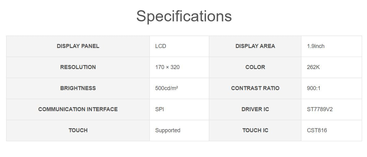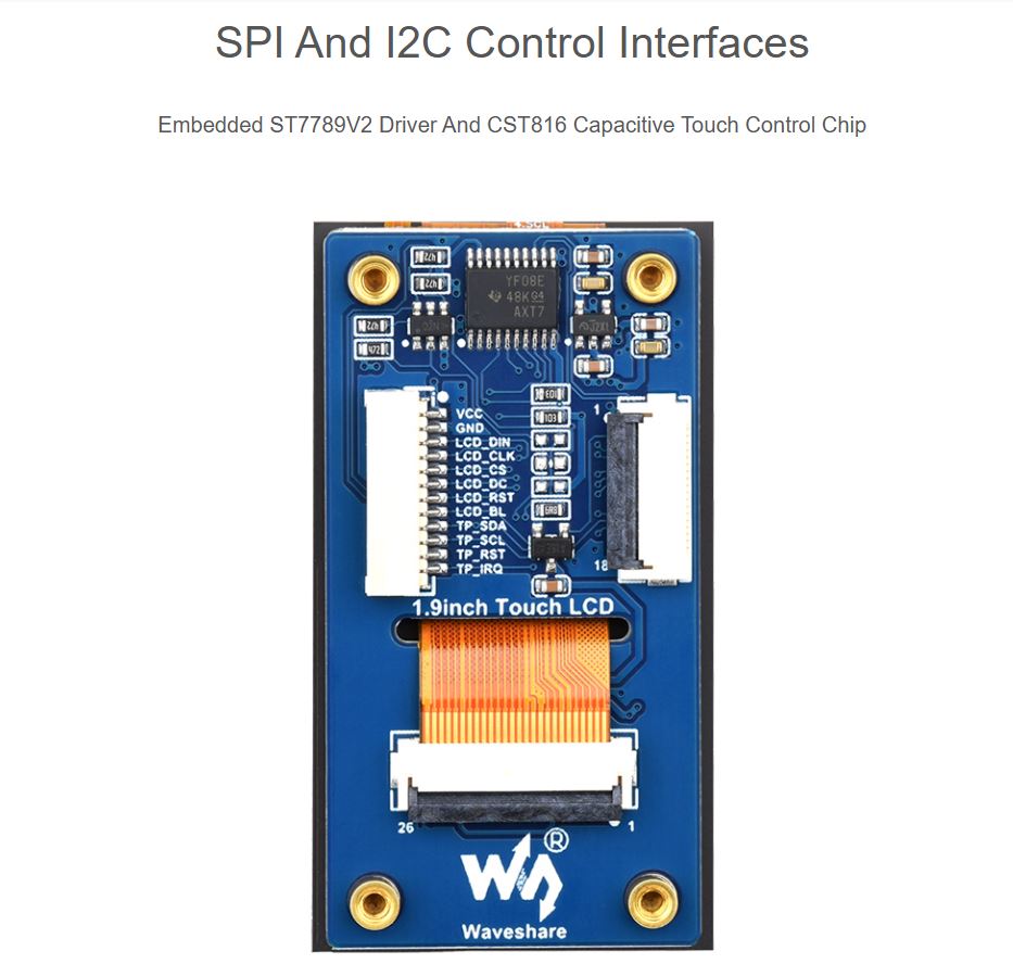 - Embedded ST7789V2 driver chip and CST816 capacitive touch control chip, using SPI and I2C communication respectively, minimizes required IO pins, supports controller boards like Raspberry Pi / ESP32S3 / Raspberry Pi Pico / Arduino