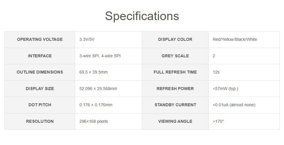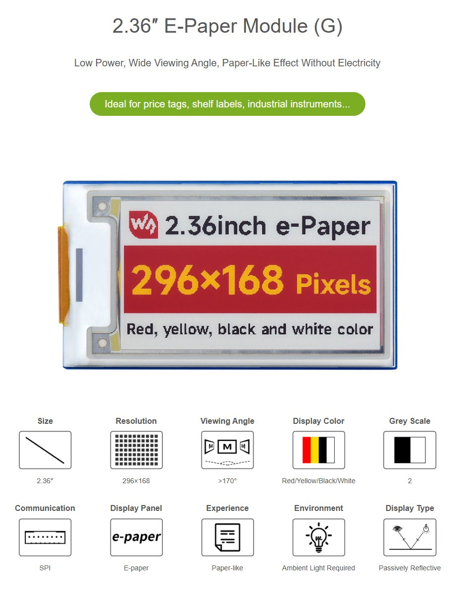 2.36inch E-Paper Module (G), 296 × 168, Red/Yellow/Black/White