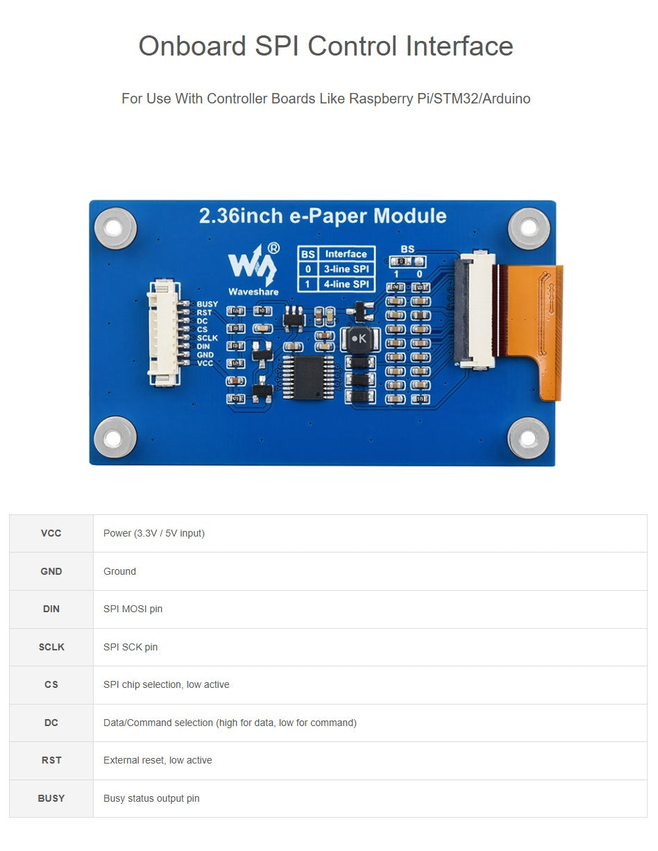 - Comes with development resources and manual(driver board schematic, examples for Raspberry Pi/Arduino/STM32)