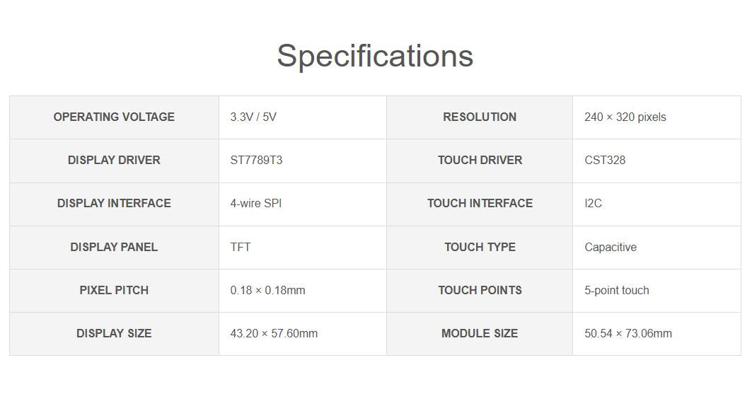- Embedded with ST7789T3 driver chip and CST328 capacitive touch control chip, using SPI and I2C communication respectively, minimizes required IO pins