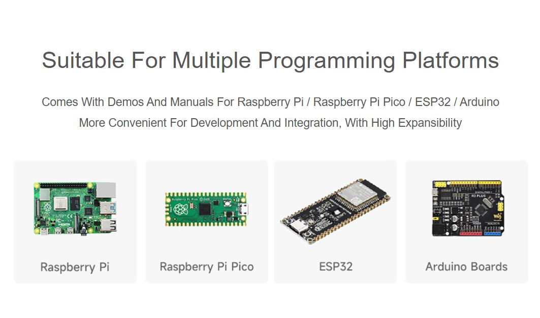 - Comes with online development resources and manual (examples for Raspberry Pi / ESP32S3 / Raspberry Pi Pico / Arduino)