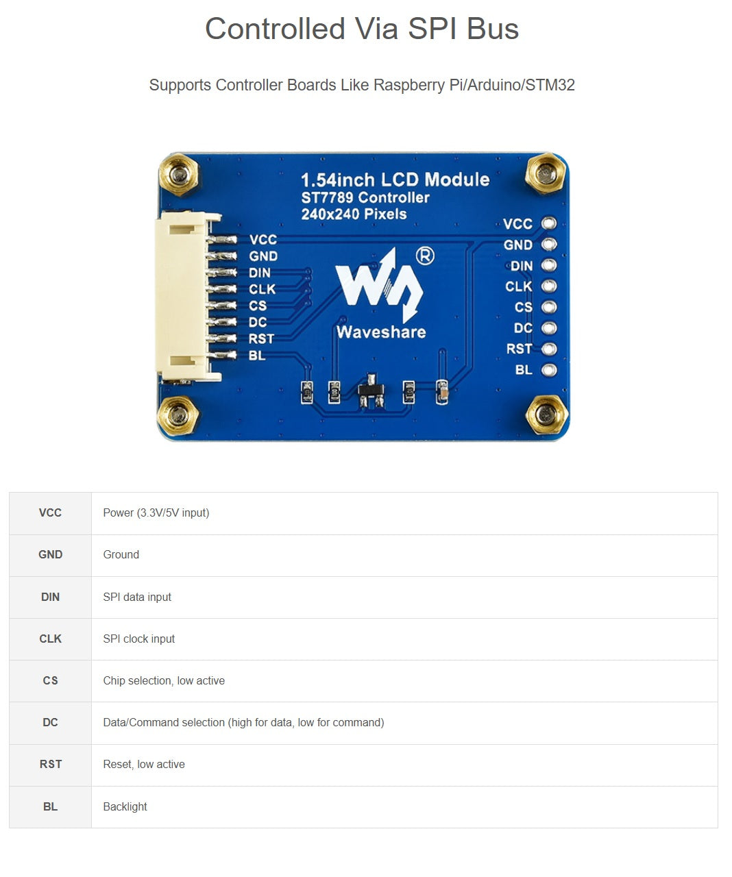 - SPI interface, minimizes required IO pins, supports controller boards like Raspberry Pi/Arduino/STM32