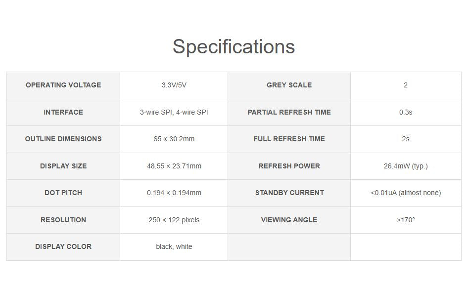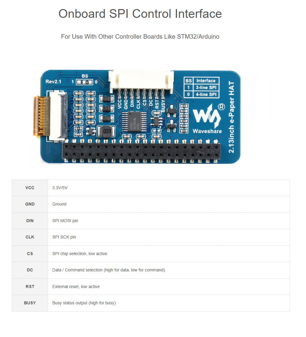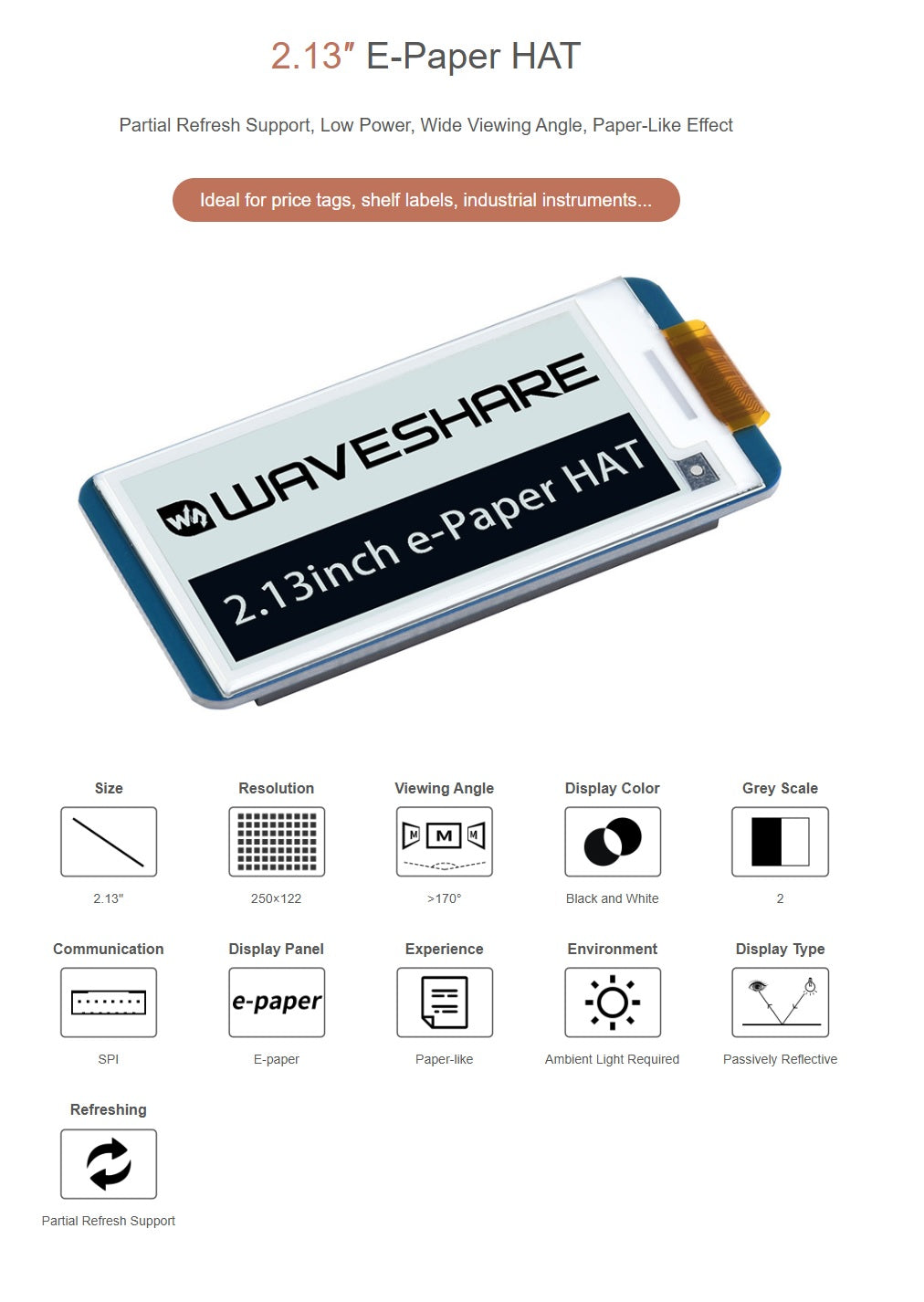 250x122, 2.13inch E-Ink display HAT for Raspberry Pi, SPI interface