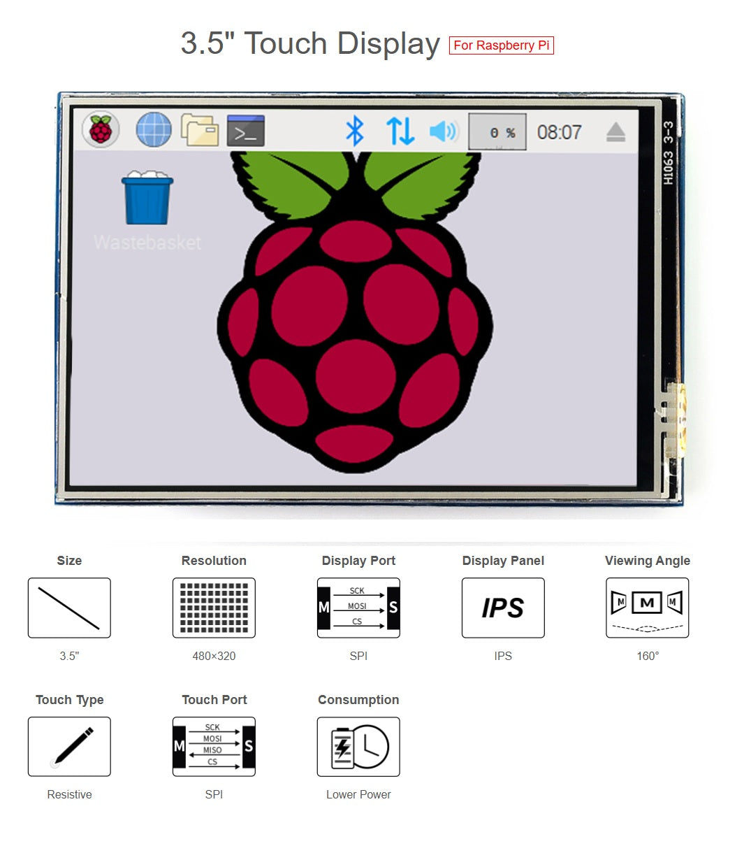 3.5inch Resistive Touch Display (B) for Raspberry Pi, 480×320, IPS Screen, SPI