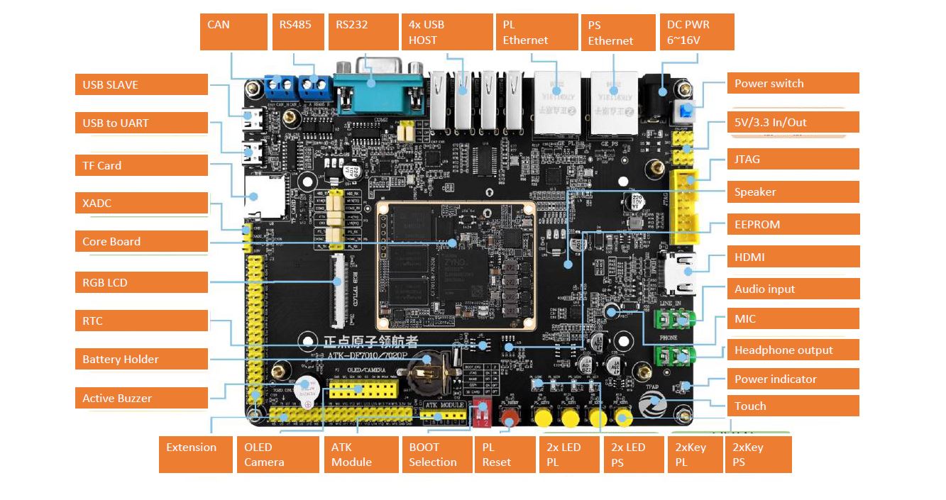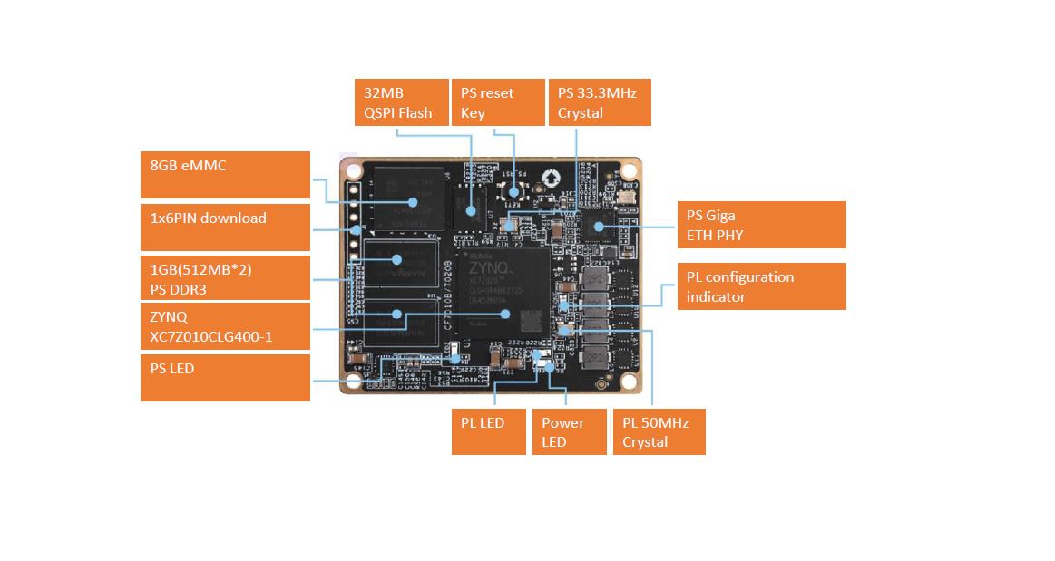 1 Core Board Connector Interface (one on top and one on bottom), compatible with ZYNQ 7020/ZYNQ 7010 core boards.