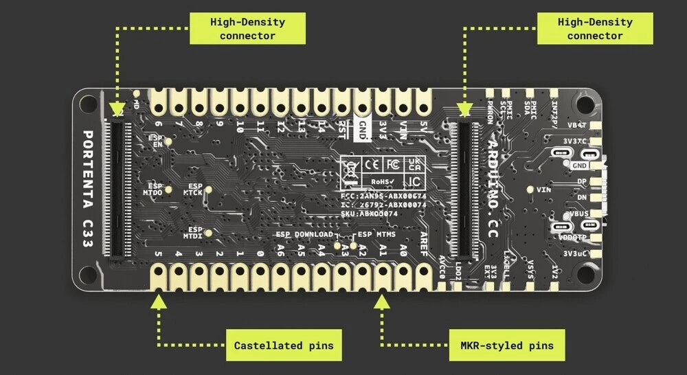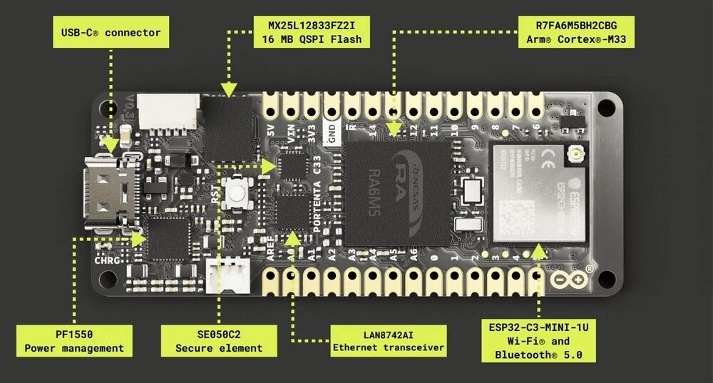 The Arduino Portenta C33 is a streamlined module that offers the high performance of the Arduino Portenta family at a lower price point, thanks to optimizations and streamlined features. Ideal to developing cost-effective, real-time applications, the Portenta C33 features the ARM® Cortex® M33 microcontroller by global leader Renesas and supports MicroPython and other high-level programming languages. Thanks to its onboard Wi-Fi and Bluetooth® Low Energy connectivity, the module stands out as an ideal solution for IoT gateways, remote control systems, fleet management, and process tracking.