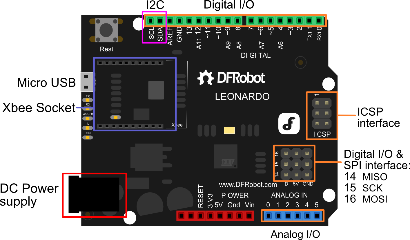 Featured in Make: The Maker’s Guide to Boards, DFRobot Leonardo with Xbee Socket is compatible with Arduino Leonardo. The "Arduino Leonardo" is based on the ATmega32u4 chip. It is the latest addition to the Arduino family. Compared with the earlier Arduino controllers, using the ATmega32U4 as its sole microcontroller, allows the Leonardo to be cheaper and simpler to use. Also, because the 32U4 is handling the USB directly, code libraries allow the board to emulate a computer keyboard, mouse, and more using the USB-HID protocol!