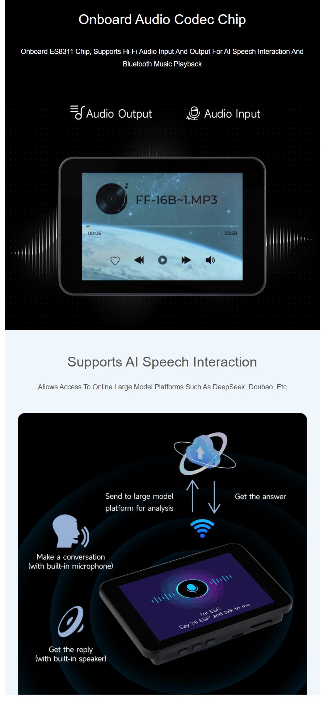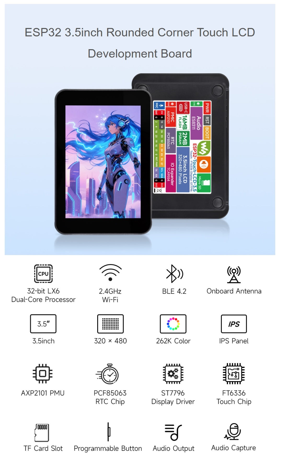 ESP32-Touch-LCD-3.5 is a highly integrated development board. Equipped with a 3.5inch capacitive IPS display, power management IC, RTC chip, and audio codec IC. Suitable for ESP32 learning and secondary development, featuring multiple functions including AI speech interaction and Bluetooth music playback.