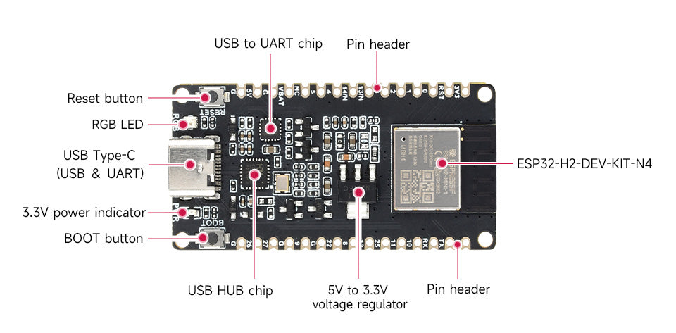 Adopts ESP32-H2-MINI-1-N4 module, which is equipped with RISC-V 32-bit single-core processor, up to 96MHz main frequency, built-in 4MB Flash; Integrates rich peripherals including SPI, UART, I2C, I2S, LED PWM, ADC and other interfaces; Onboard CH343 and CH334 USB HUB chips, supports USB and UART development at the same time via a USB-C port. Compatible with the pinout of the ESP32-H2-DevKitM-1 development board, more convenient to use and expand a variety of peripheral modules.