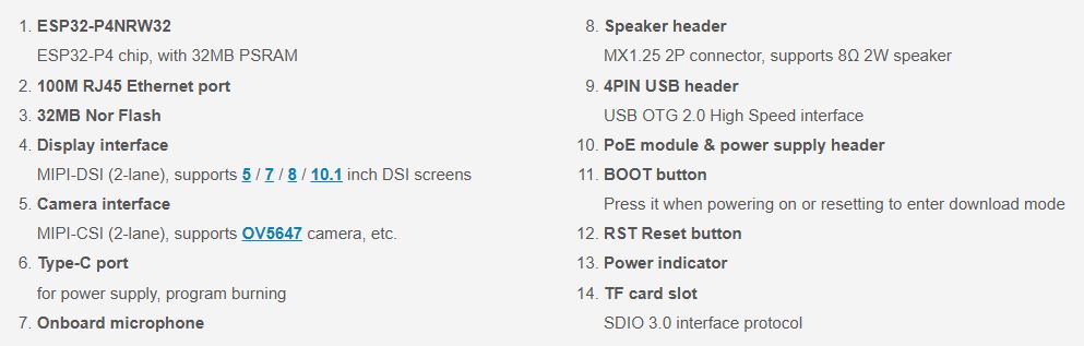This product is a multimedia development board based on ESP32-P4. It features rich Human-Machine interfaces, including MIPI-CSI (with integrated Image Signal Processor), MIPI-DSI, SPI, I2S, I2C, LED PWM, MCPWM, RMT, ADC, UART, TWAI, etc. Additionally, it supports USB OTG 2.0 HS, Ethernet port and onboard 40PIN GPIO header which is compatible with some Raspberry Pi Pico HATs, enabling a wider range of application adaptability.