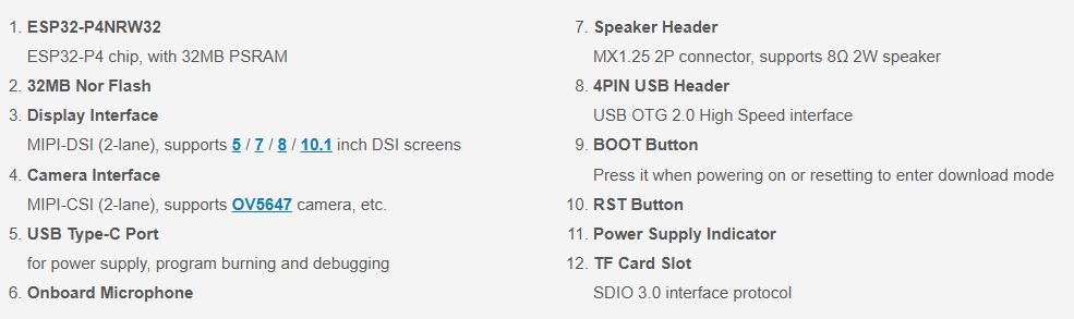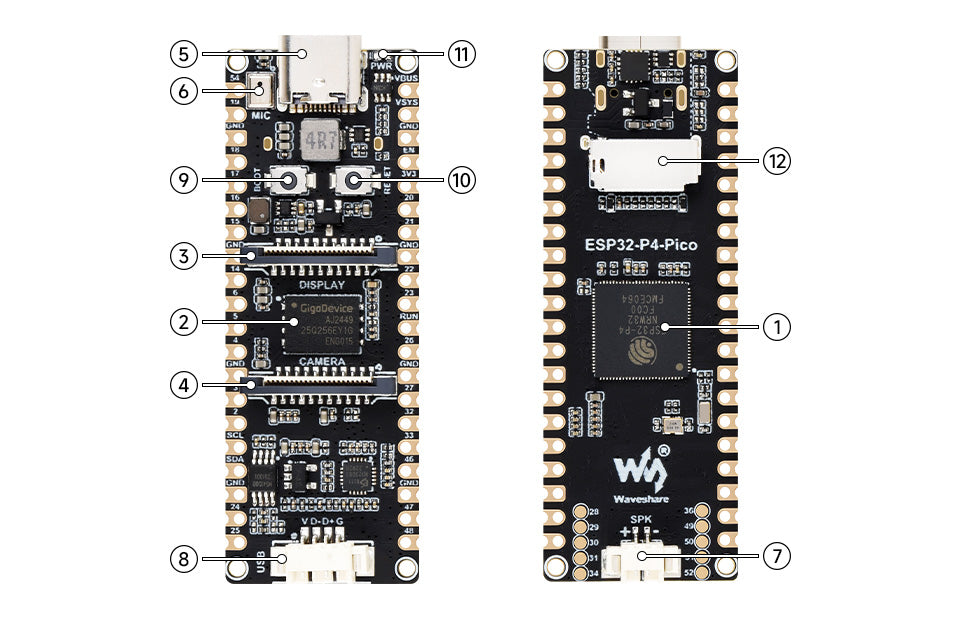 This product is a multimedia development board based on ESP32-P4. It features rich Human-Machine interfaces, including MIPI-CSI (with integrated Image Signal Processor), MIPI-DSI, SPI, I2S, I2C, LED PWM, MCPWM, RMT, ADC, UART and TWAI, etc. Additionally, it supports USB OTG 2.0 HS, and onboard 40PIN GPIO header which is compatible with some Raspberry Pi Pico HATs, enabling a wider range of application adaptability.