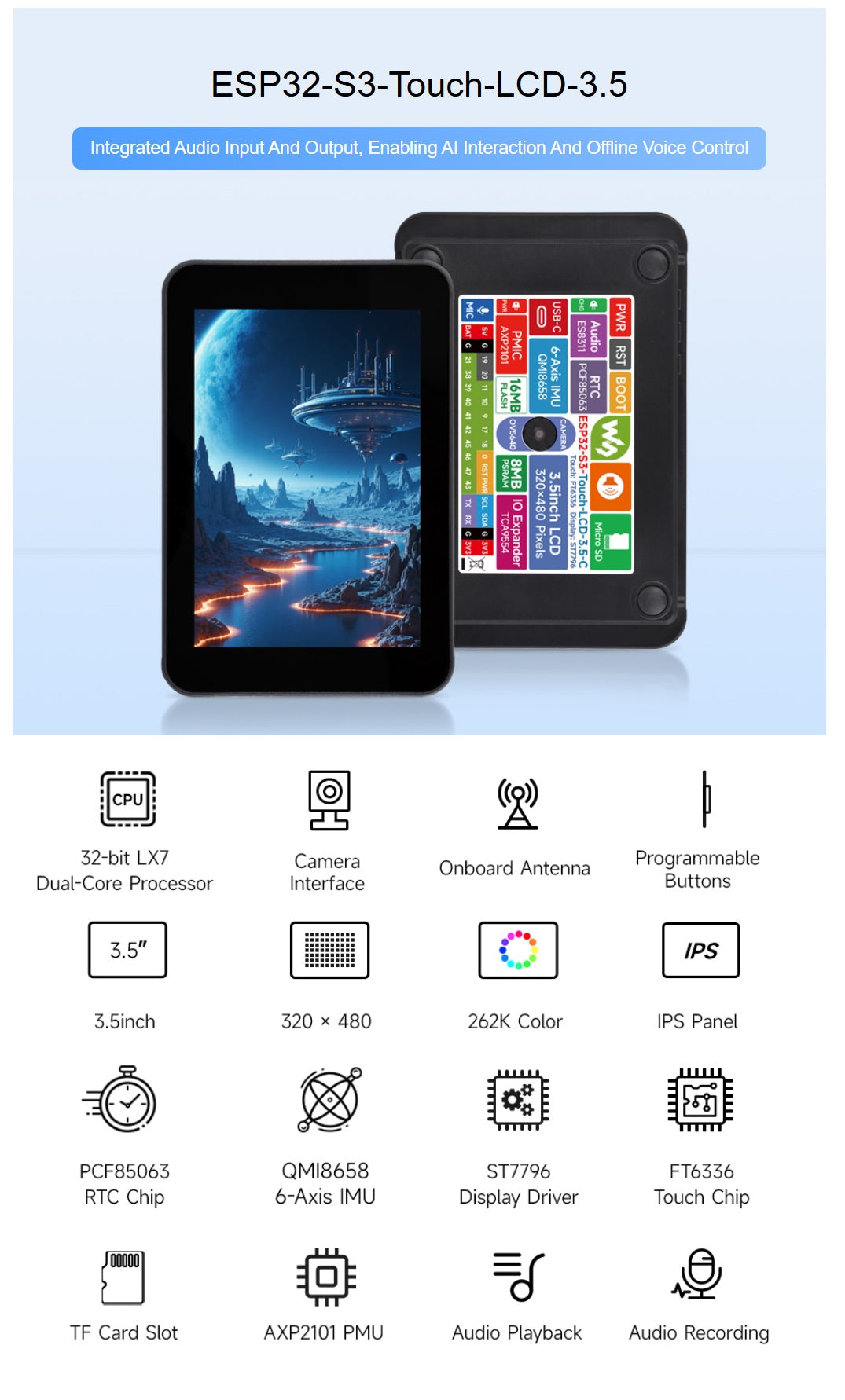 ESP32-S3-Touch-LCD-3.5 is a high-performance, highly integrated MCU board. Onboard 3.5inch capacitive touch IPS display, power management IC, 6-axis sensor (3-axis accelerometer and 3-axis gyroscope), RTC, low power audio codec, and so on, which makes it easy for you to develop and integrate into the products quickly.