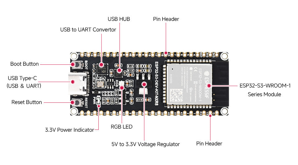 - Adopts ESP32-S3-WROOM-1 series module with Xtensa 32-bit LX7 dual-core processor, capable of running at 240 MHz