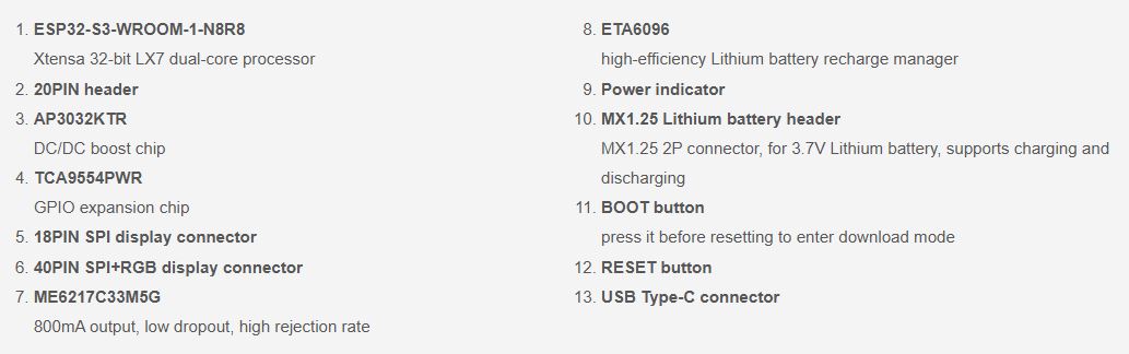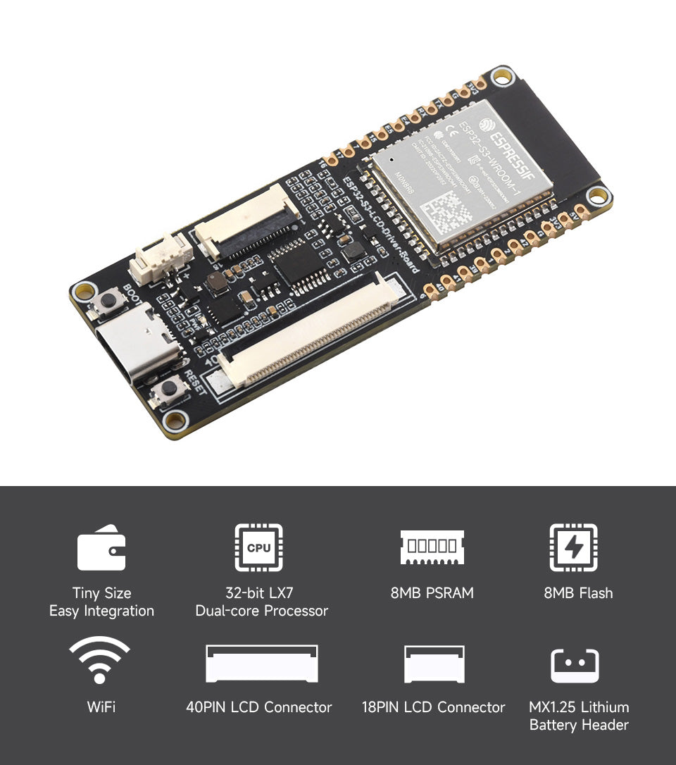 Adopts ESP32-S3-WROOM-1-N8R8 module, which is equipped with Xtensa 32-bit LX7 dual-core processor with 240MHz running frequency, built-in 512KB SRAM (TCM) and 8MB PSRAM; Onboard ETA6096 high-efficiency Lithium battery recharge manager and MX1.25 lithium battery header, adapting 20pin GPIO header which is compatible with 18Pin SPI screen. Supports expanding various peripheral devices and is easy to use.