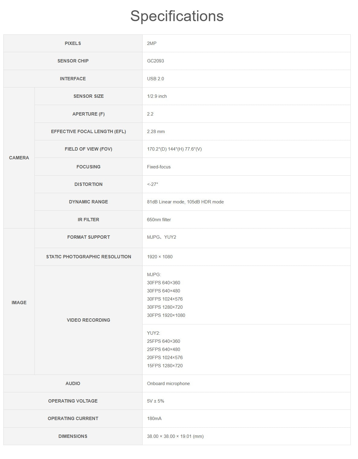GC2093 2MP USB Camera, 170°FOV, F2.2 aperture, 2.28mm focal length, Wide Dynamic Backlight Imaging, Fixed-Focus, Onboard Microphone