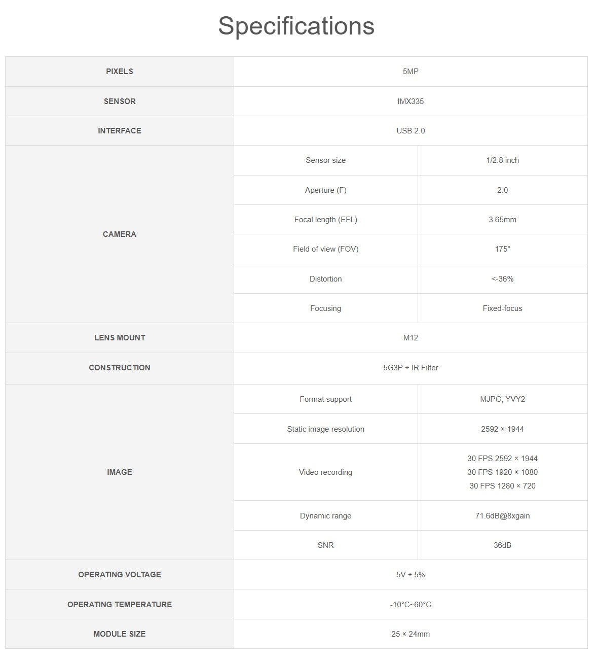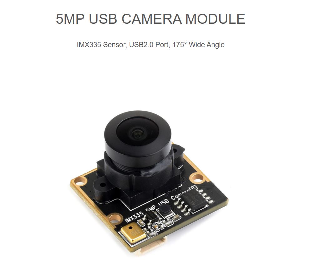 IMX335 5MP USB Camera, 175°FOV, fixed-focus, wide angle, low-light sensitivity, wide dynamic range