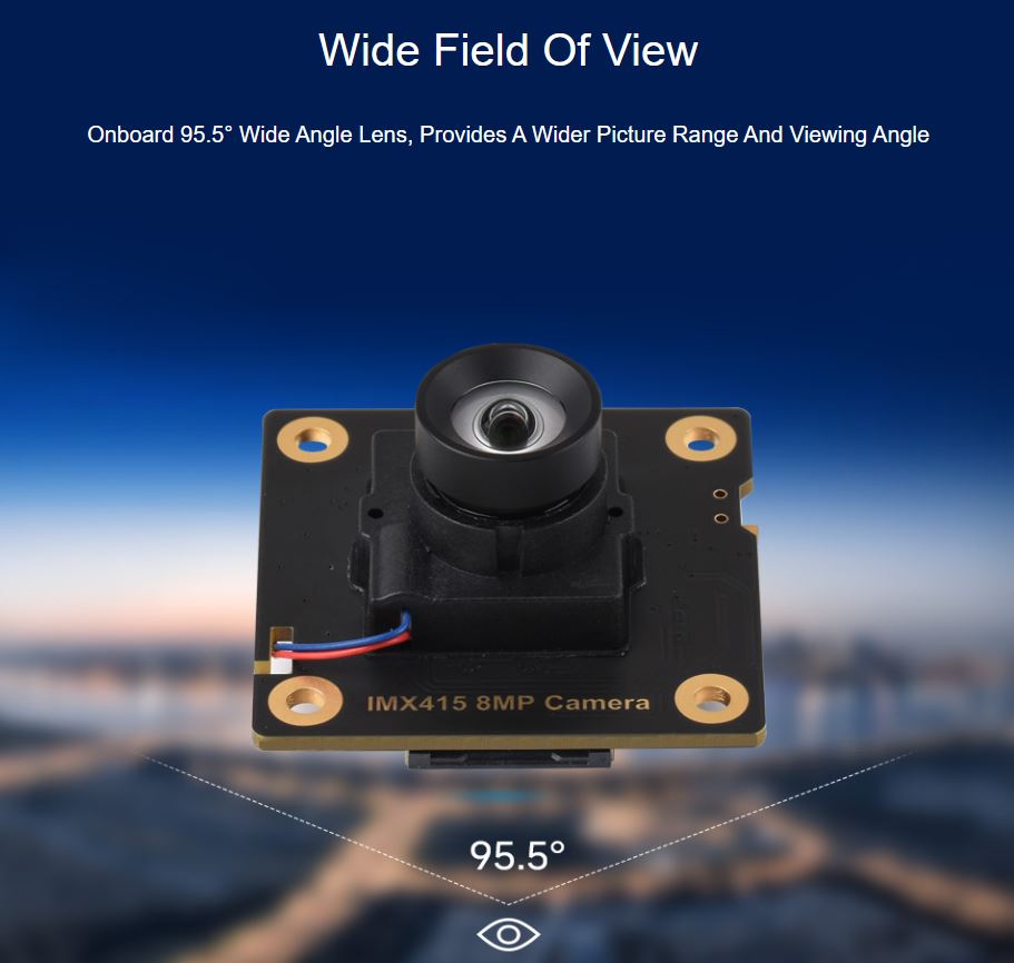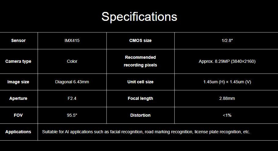 IMX415 8MP Camera, 95.5°FOV, F2.4 aperture, 2.88mm focal length, high SNR, Good Low Light Performance