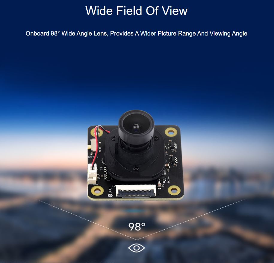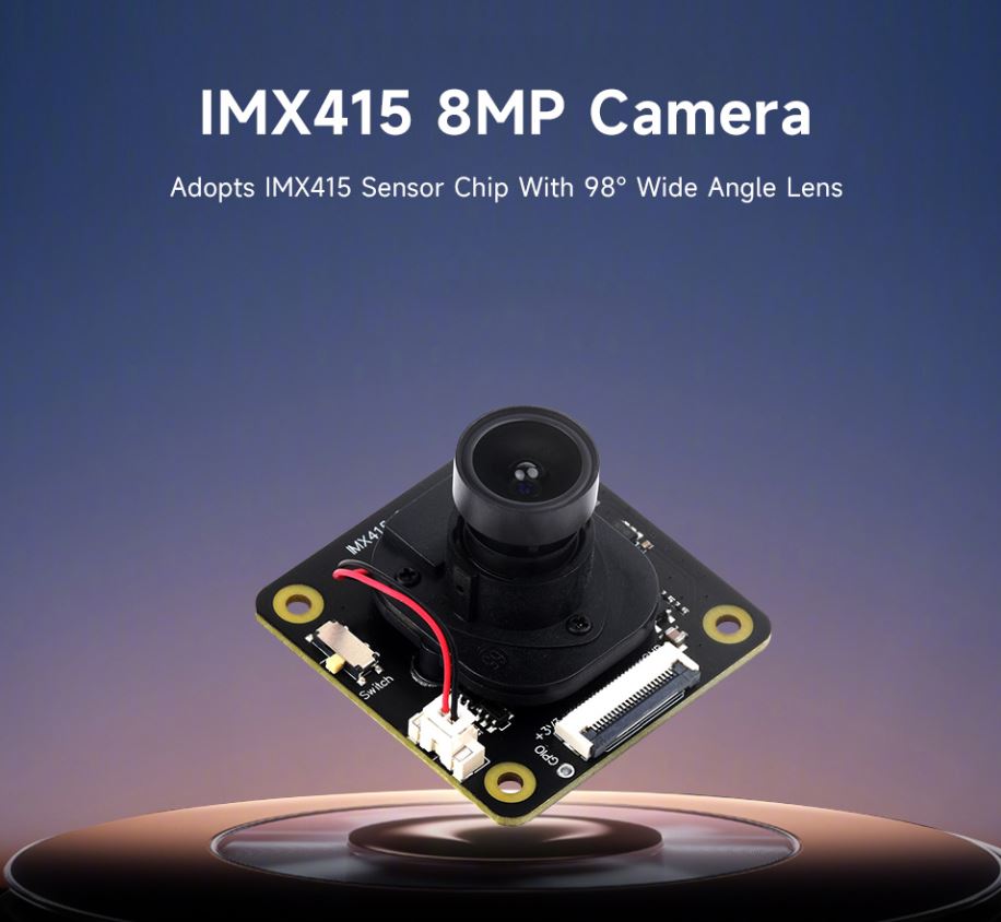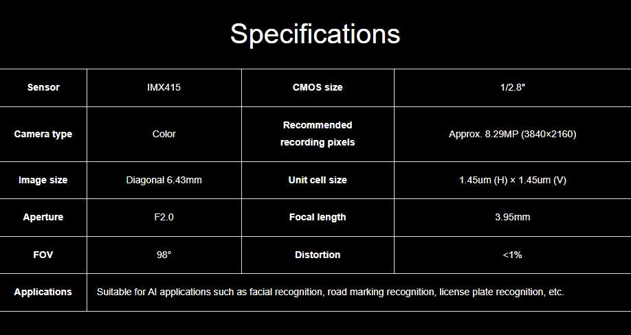 IMX415 8MP Camera, 98°FOV, F2.0 aperture, 3.95mm focal length, high SNR, Good Low Light Performance, and Low Distortion