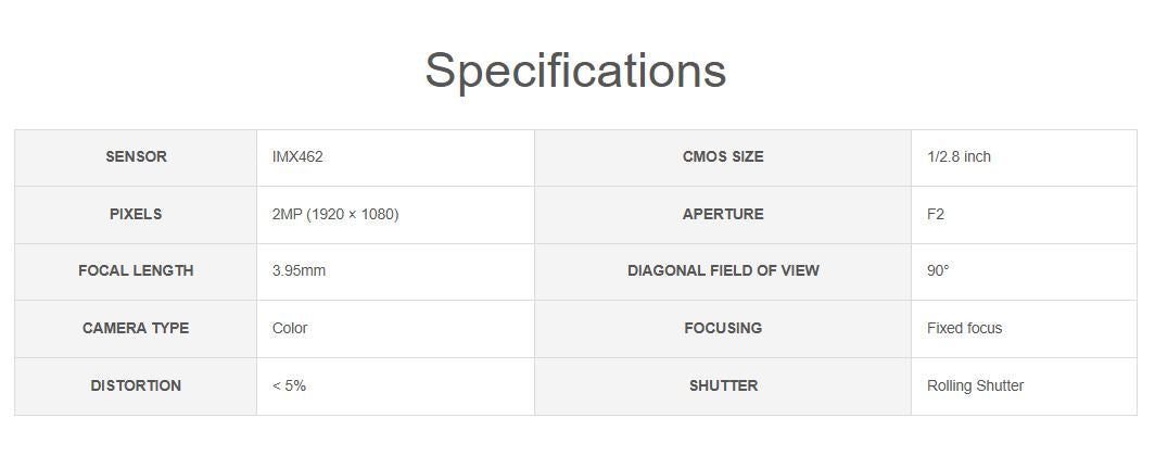 IMX462 2MP IR-CUT Camera, 90° DFOV, F2 aperture, 3.95 focal length, Starlight Camera Sensor, Fixed-Focus