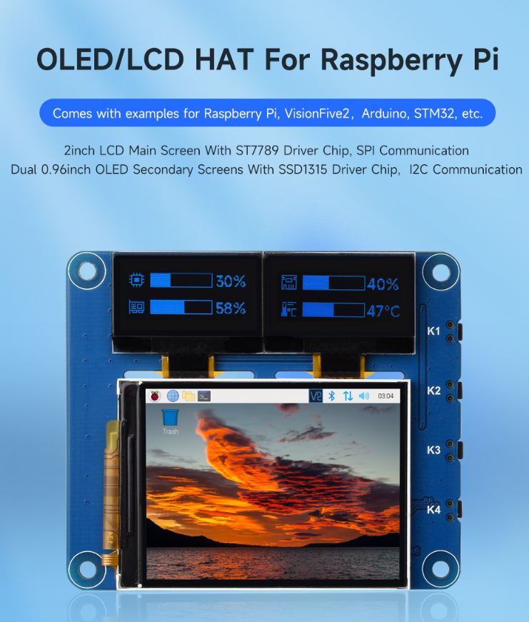 Raspberry Pi OLED/LCD HAT, Onboard 2inch IPS LCD Main Screen and Dual 0.96inch Blue OLED Secondary Screens, With 40PIN GPIO Header, Compatible With Raspberry Pi Series Boards