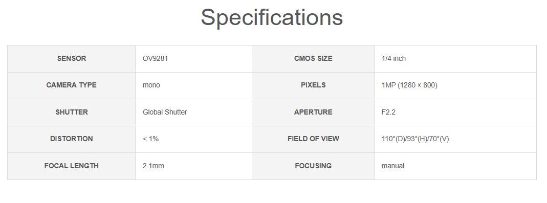 OV9281 1MP Mono Camera, 110°FOV, F2.2 aperture, 2.1mm focal length, Global Shutter