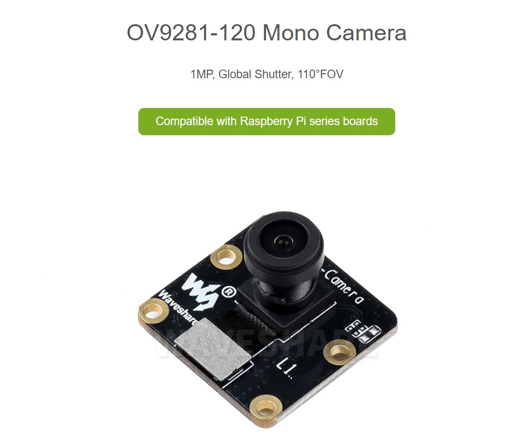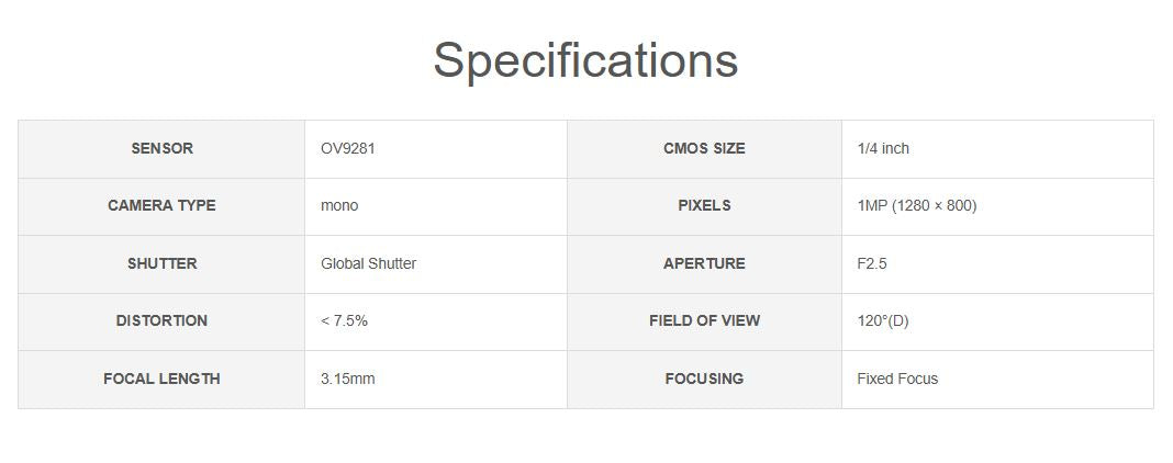 OV9281 1MP Mono Camera, 120°FOV, F2.5 aperture, 3.15mm focal length, Global Shutter