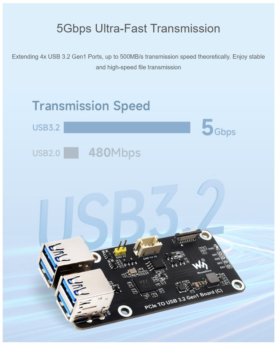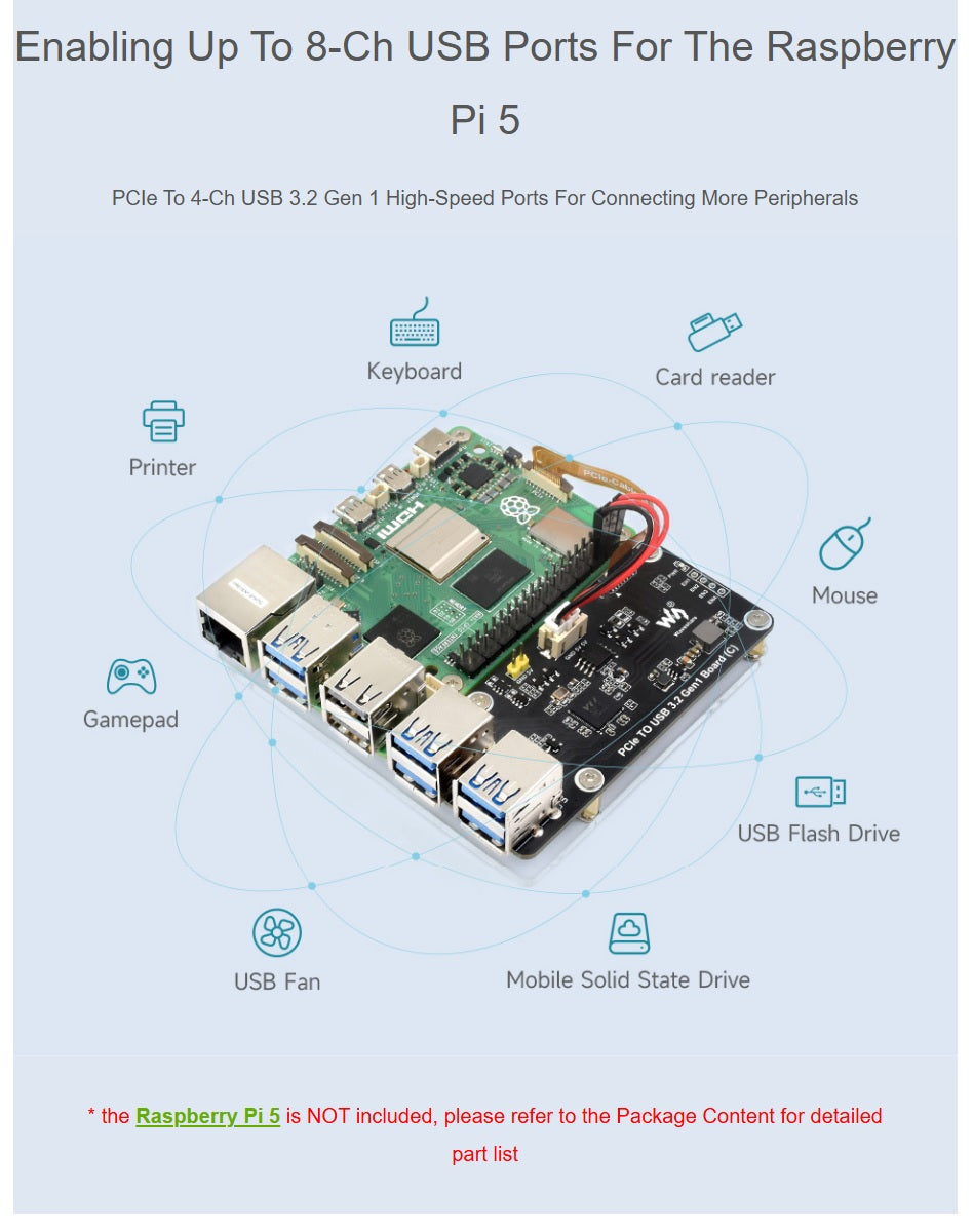 PCIe To 4-Ch USB3.2 Gen1 Board (C) For Raspberry Pi 5, Up To 5Gbps Transmission Speed, Driver-Free, Plug And Play, Raspberry Pi 5 PCIe Adapter