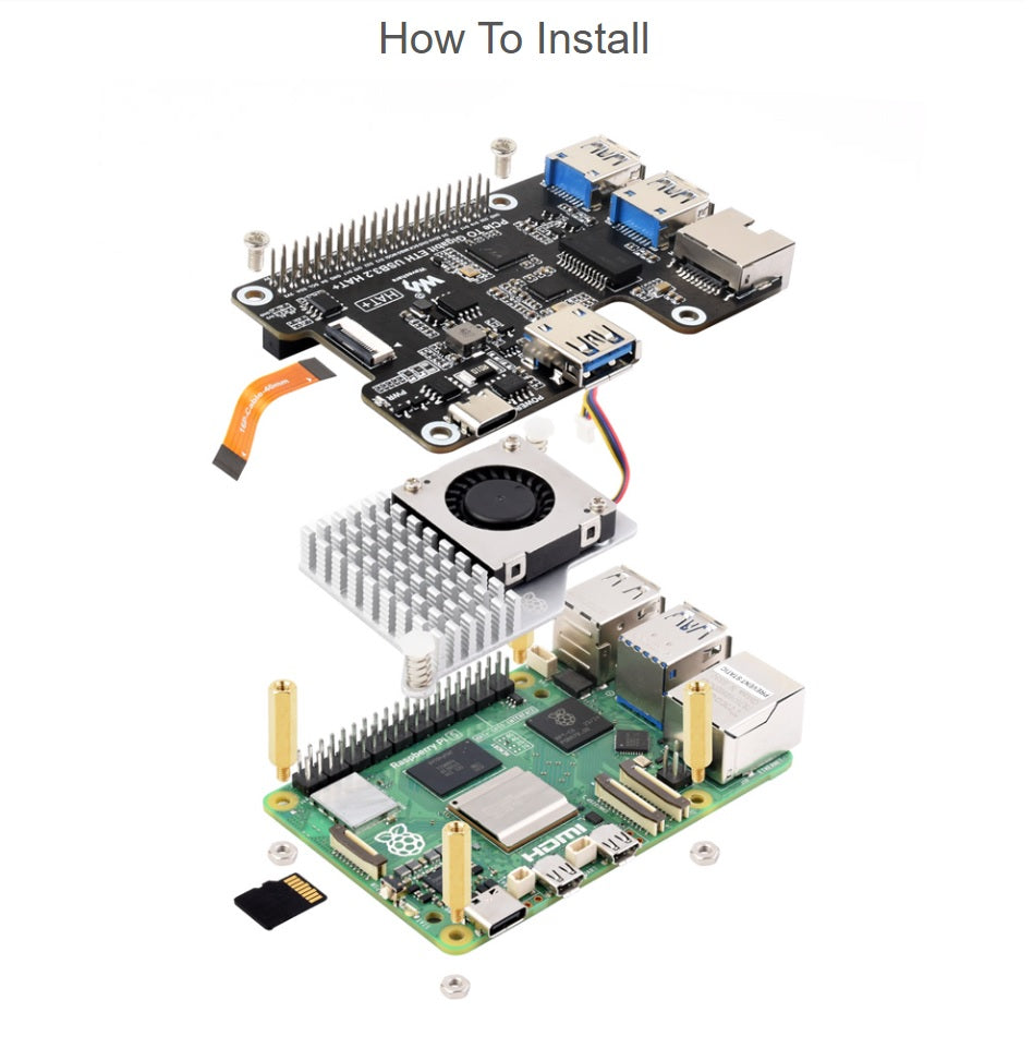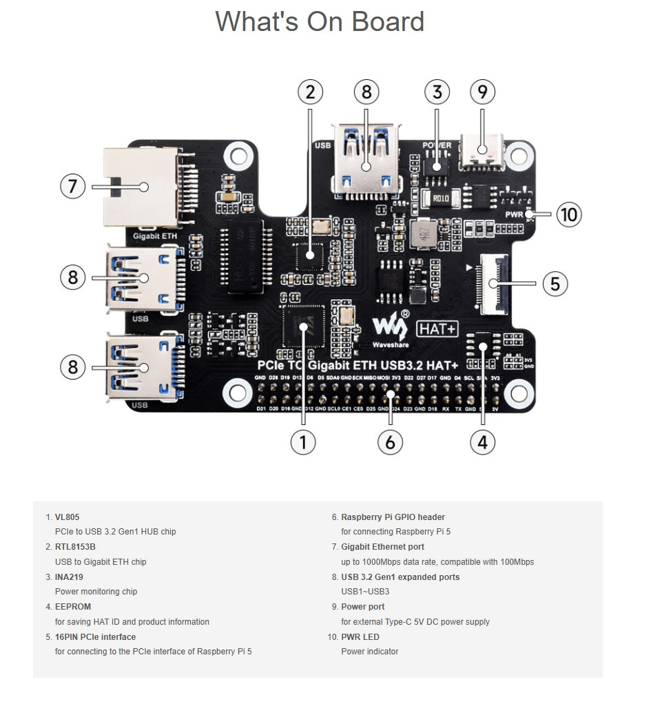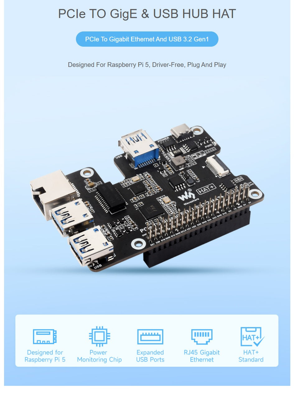 PCIe To Gigabit Ethernet And USB 3.2 Gen1 HAT For Raspberry Pi 5, 3x USB 3.2 Gen1, 1x Gigabit Ethernet, Driver-Free, Plug And Play, Raspberry Pi 5 PCIe HAT