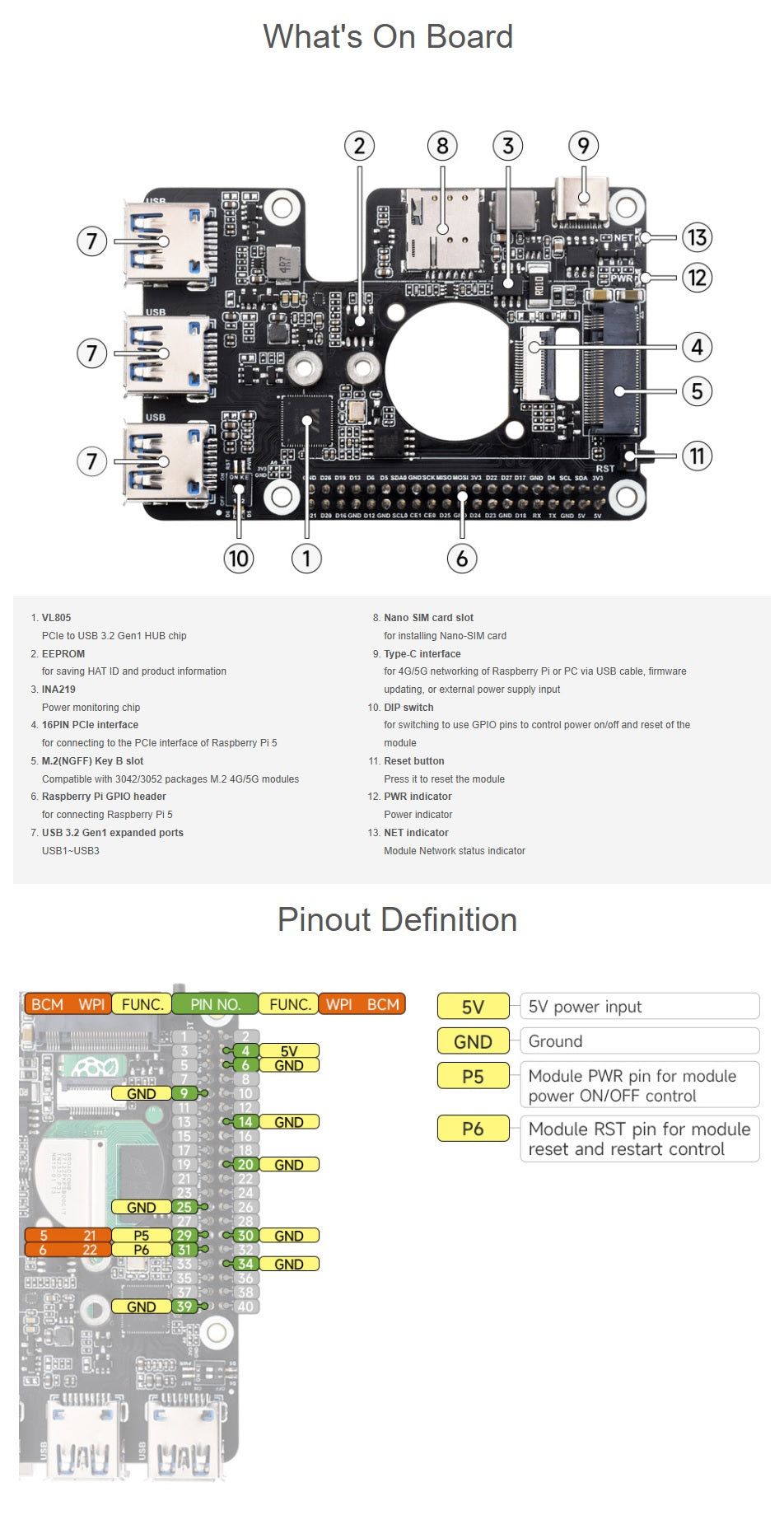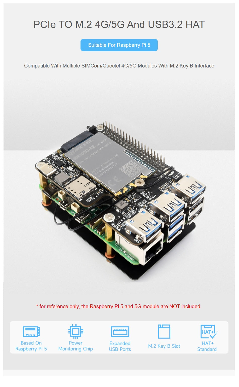 PCIe to M.2 4G/5G And USB 3.2 HAT for Raspberry Pi 5, Compatible with SIMCom/Quectel 4G/5G modules, Raspberry Pi 5 HAT, High-speed Networking