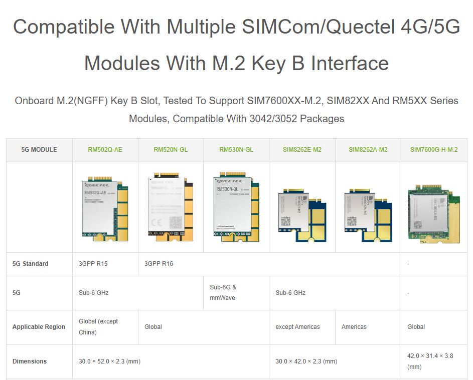 - Onboard M.2(NGFF) Key B slot, supports SIM7600XX-M.2, SIM82XX and RM5XX series 4G/5G modules and is compatible with 3042/3052 packages