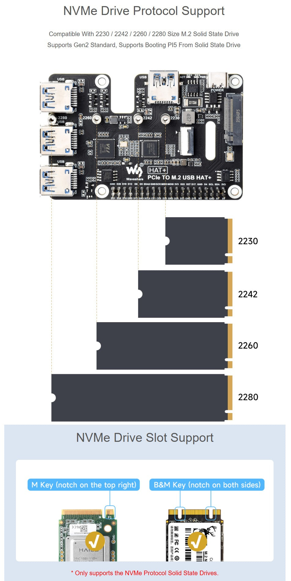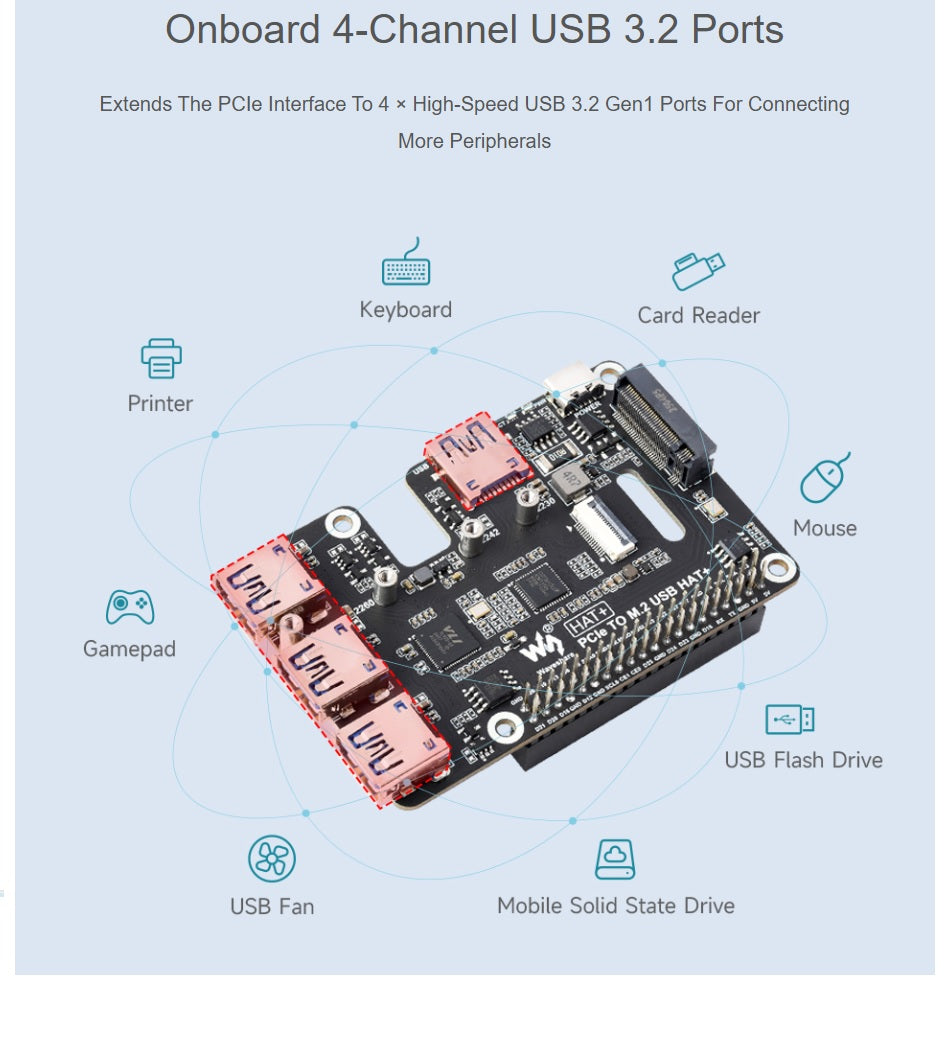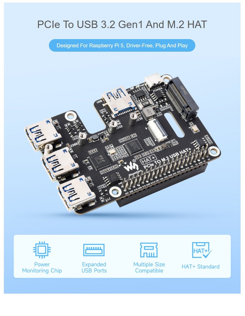 PCIe To USB 3.2 Gen1 And M.2 HAT For Raspberry Pi 5, Supports NVMe Protocol Solid State Drive, Expands 4-Ch USB 3.2 Ports, High-speed Reading / Writing, HAT+ Standard