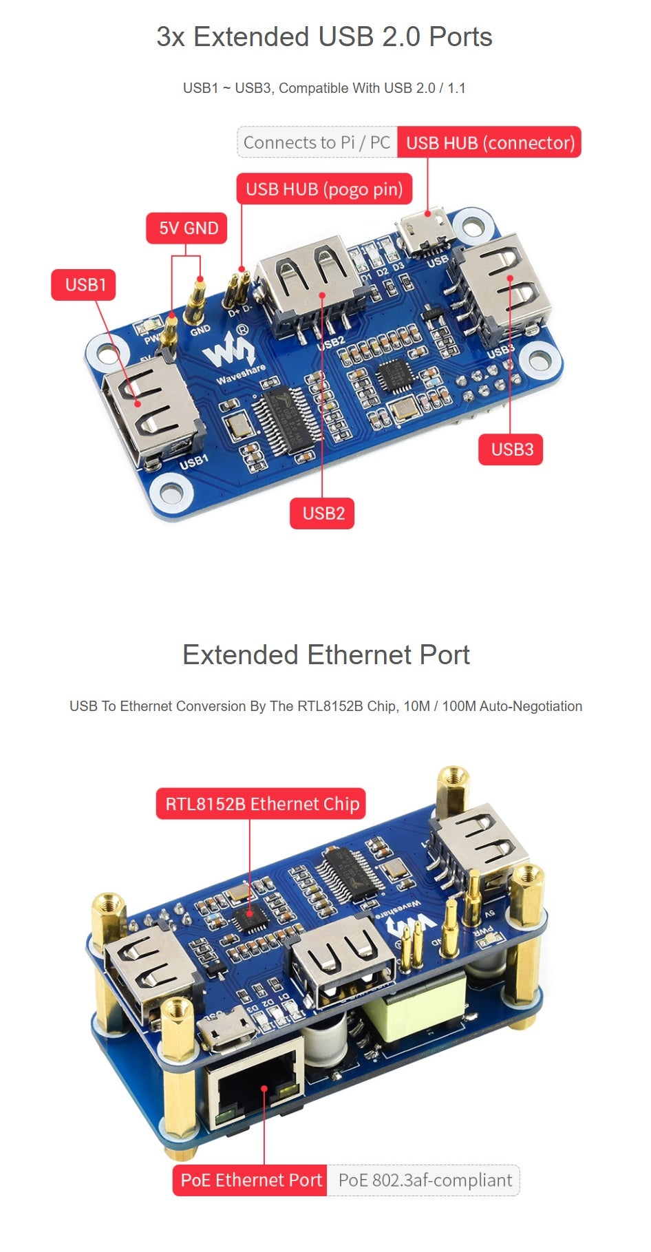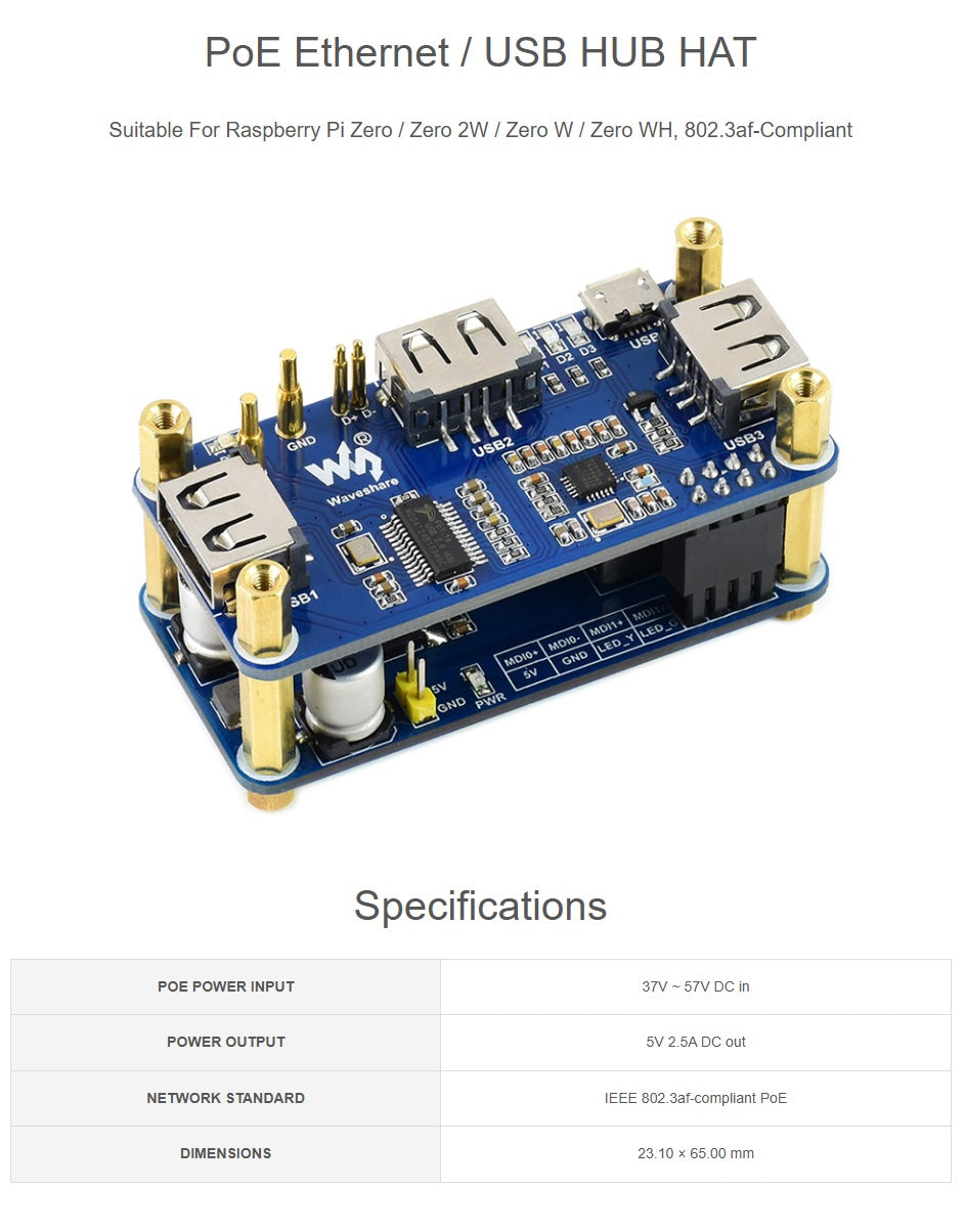The PoE/ETH/USB HUB HAT is a PoE (Power over Ethernet) USB HUB HAT designed for Raspberry Pi Zero. By using this small HAT and some proper 802.3af-compliant power sourcing equipments, it is possible to provide both network connection and power supply for your Raspberry Pi in only one Ethernet cable, along with 3x extended USB ports.