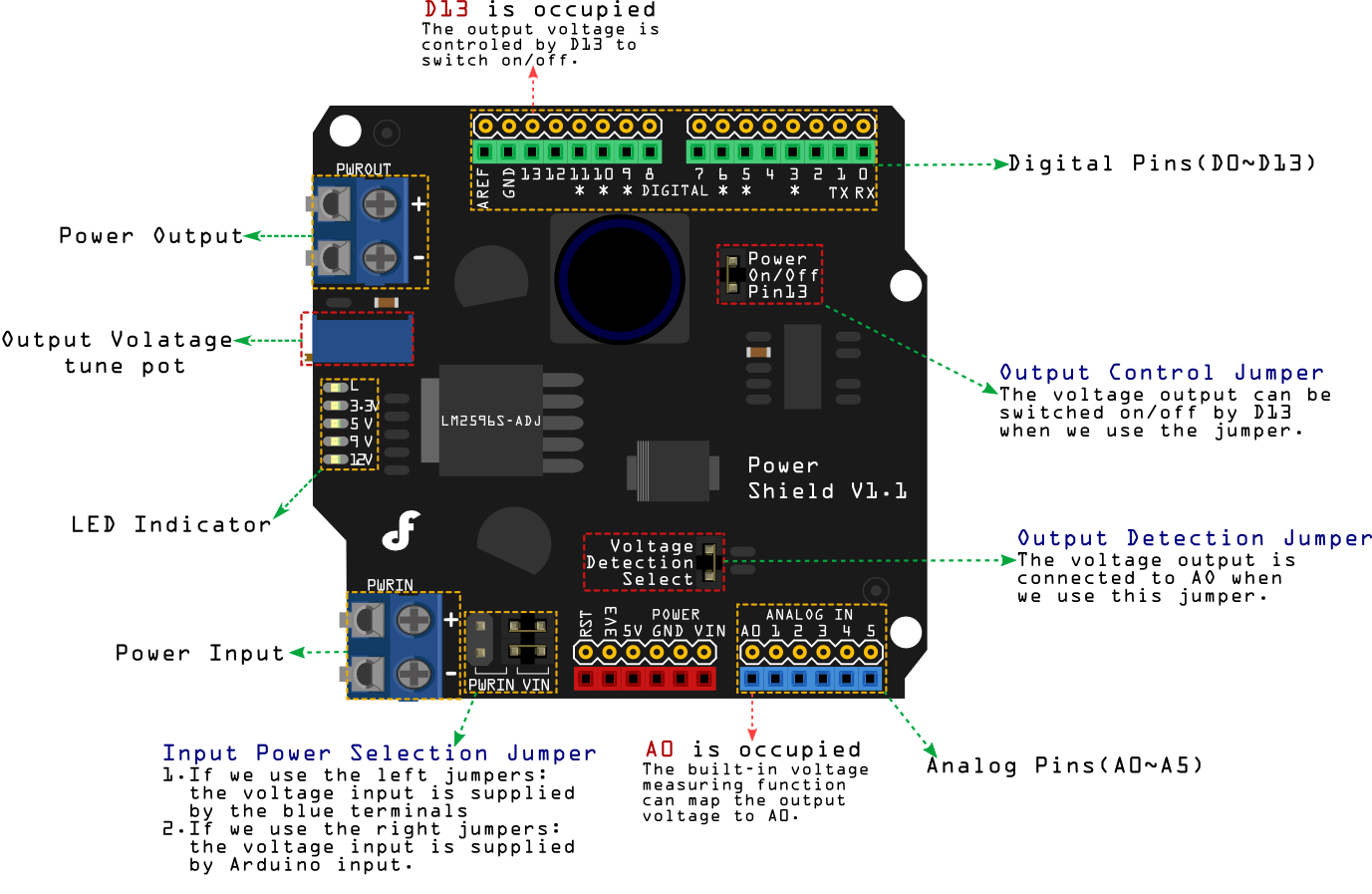 Most project of Arduino may need more than two voltage supply. When feed with from 4.5-35V, this arduino power shield able to provide a voltage range from 1.25-12V with 3A peak current. Ideal for servo control and other non-standard components. With this arduino power supply shield, your Arduino now have one power supply for all.