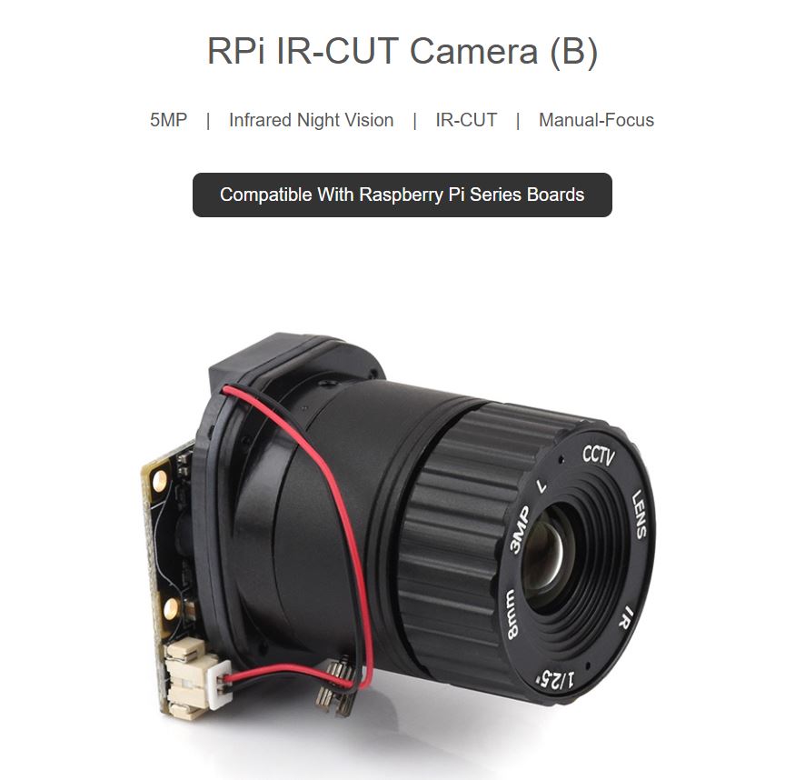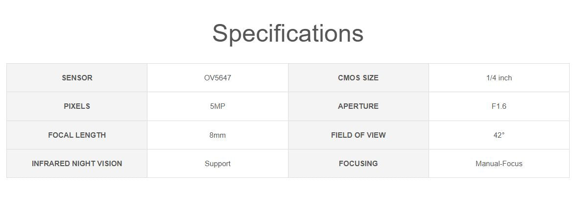 OV5647 5MP IR-CUT Camera, 42°FOV, F1.6 aperture, 8mm focal length, adjustable Focus