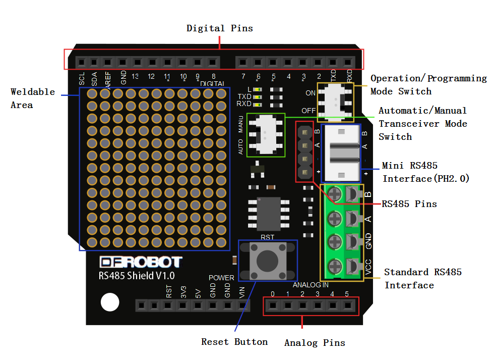 RS485 is an industrial standard for long-distance, anti-interference, and reliable communication. The Arduino RS485 shield, specially designed for the Arduino Uno board. It converts UART/Serial protocol to the RS485 protocol. This RS485 board allows Arduino talk to industrial devices.