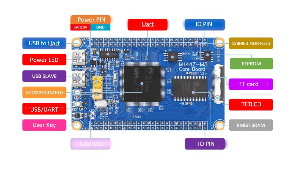 The M144Z-M3 Minimum System Board (STM32F103 Version) incorporates the following hardware design features: