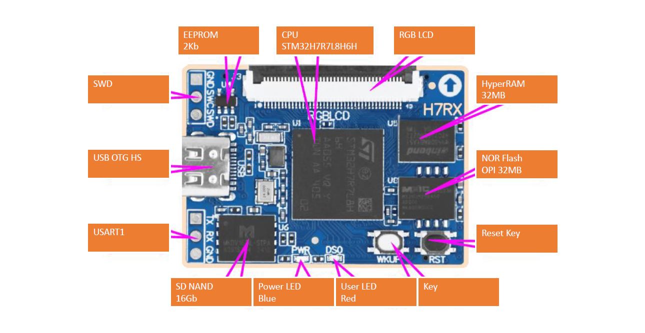 The H7RX development board adopts a core board + baseboard design.