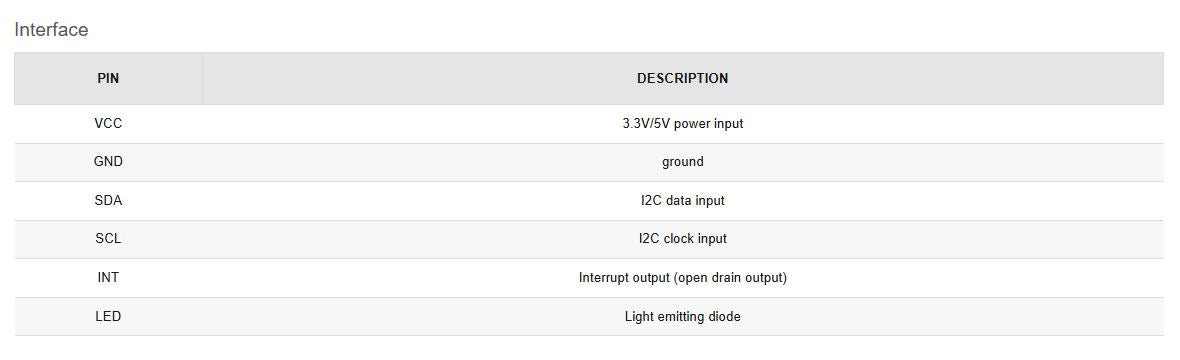 - Supports light intensity interrupt output, programmable upper and lower thresholds