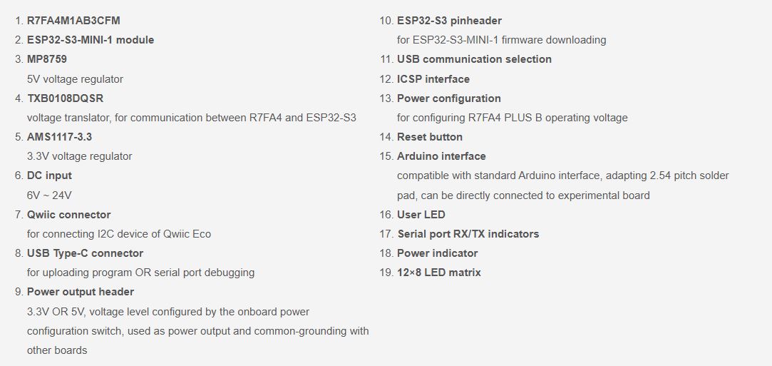 The UNO R4 WiFi combines the processing power and exciting new peripherals of the RA4M1 microcontroller from Renesas with the wireless connectivity power of the ESP32-S3 from Espressif. On top of this, the UNO R4 WiFi offers an on-board 12x8 LED matrix, Qwiic connector, VRTC, and OFF pin, covering all potential needs makers will have for their next project.