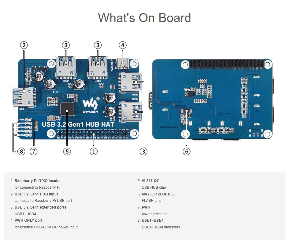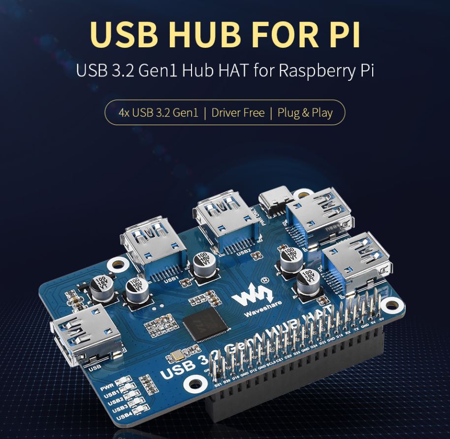 USB 3.2 Gen1 HUB HAT for Raspberry Pi, 4x USB 3.2 Gen1 Ports, driver-free
