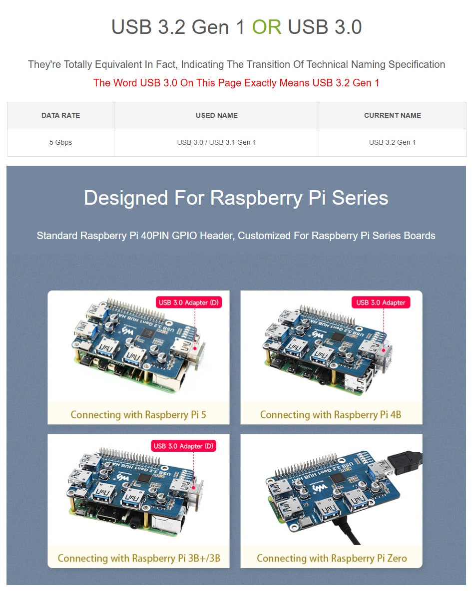 USB 3.2 Gen1 HUB HAT for Raspberry Pi, 4x USB 3.2 Gen1 Ports, Driver-Free