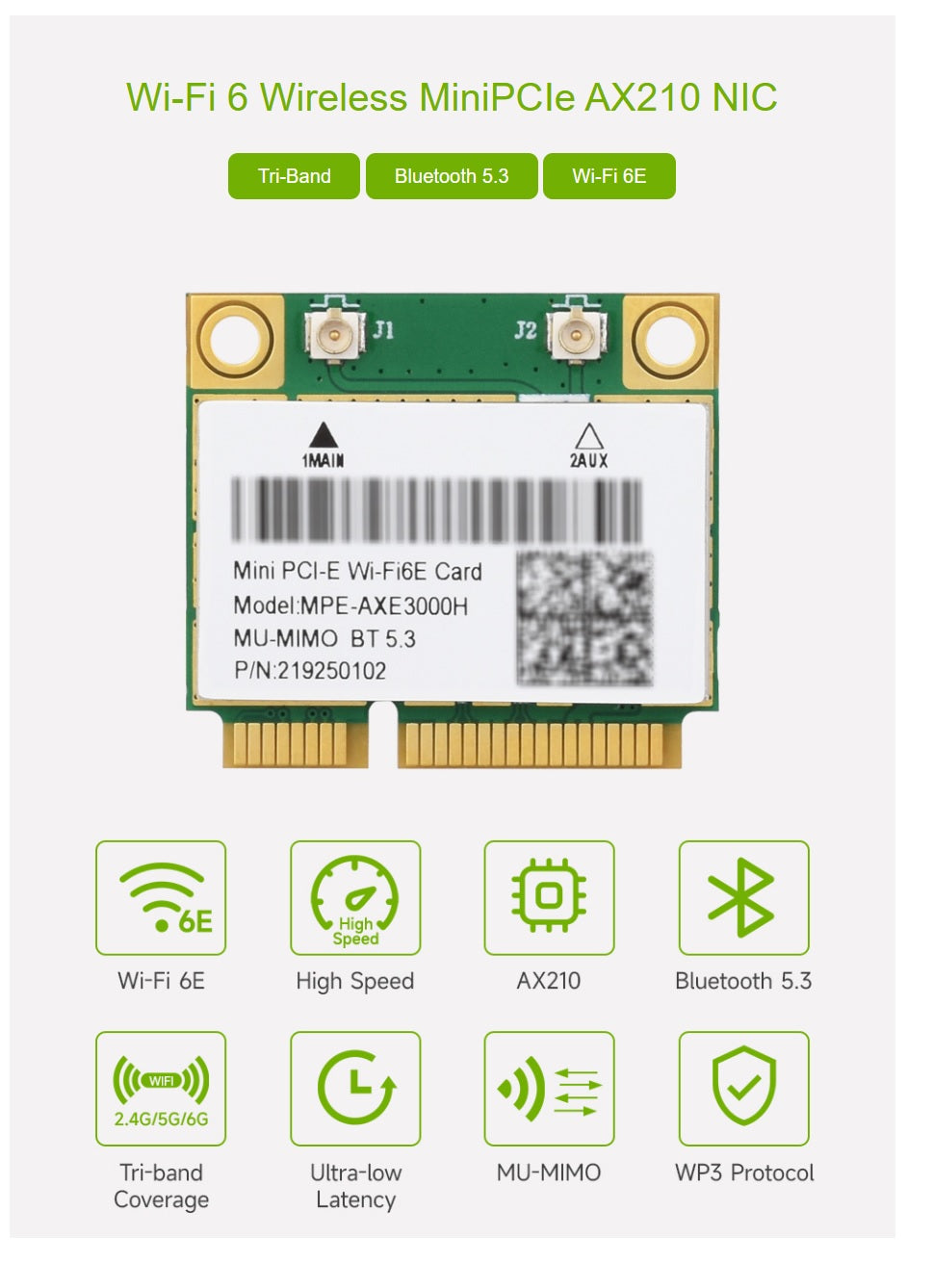 Wireless MINIPCIE AX210 NIC, Gigabit Tri-Band Wi-Fi 6E, 802.11AX Standard, Bluetooth 5.3